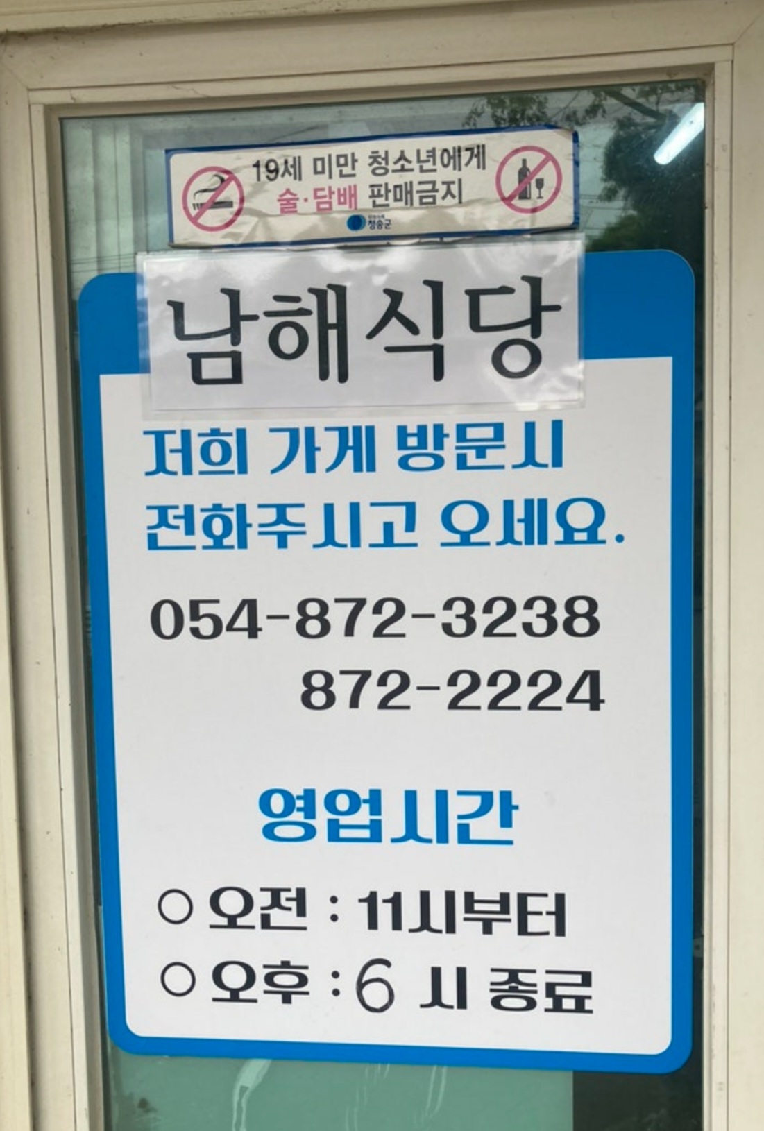 오늘은 물좋고 공기 좋기로 유명한 경북 청송에 방문하여 여러 식당을 알아보던 중 외관부터 노포 흔적과 인간미가 느껴지는 남해식당 소개합니다.