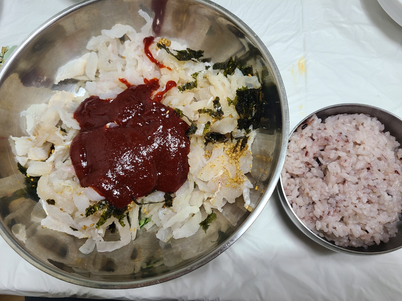 그리고 가자미가 매우 신선하여 꼬들꼬들 씹는 맛이 제대로이며, 고소합니다. 여기에 고추장, 얼음, 냉수, 흑미밥을 넣고 비벼서 드시면 됩니다. 맛있습니다. 또 먹고 싶을 정도로 생각이 나는 맛입니다.
