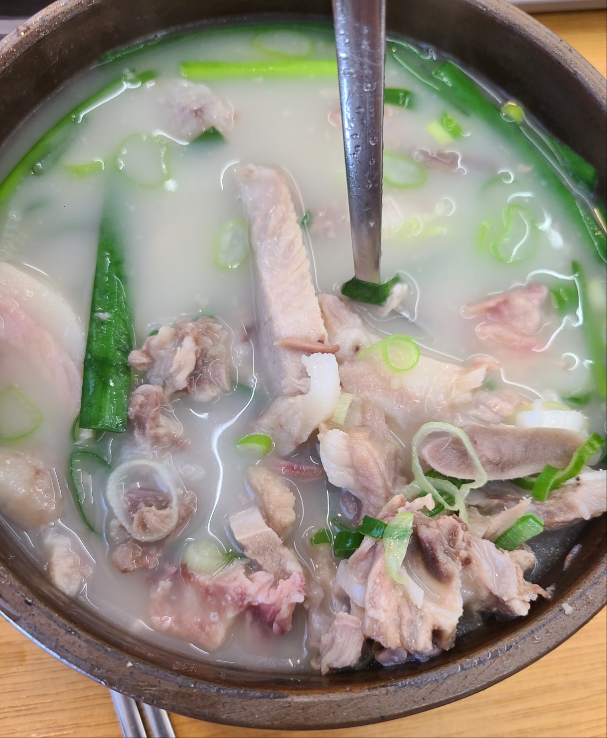 사진에서 보시는 것 처럼 돼지의 양이 정말 많이 담겨 있습니다. 그리고 비계부분과 살코기 부분이 골고루 분포되어 있으며, 깊은 국물과 어울어진 조합이 영롱한 자태를 내뿜고 있습니다.