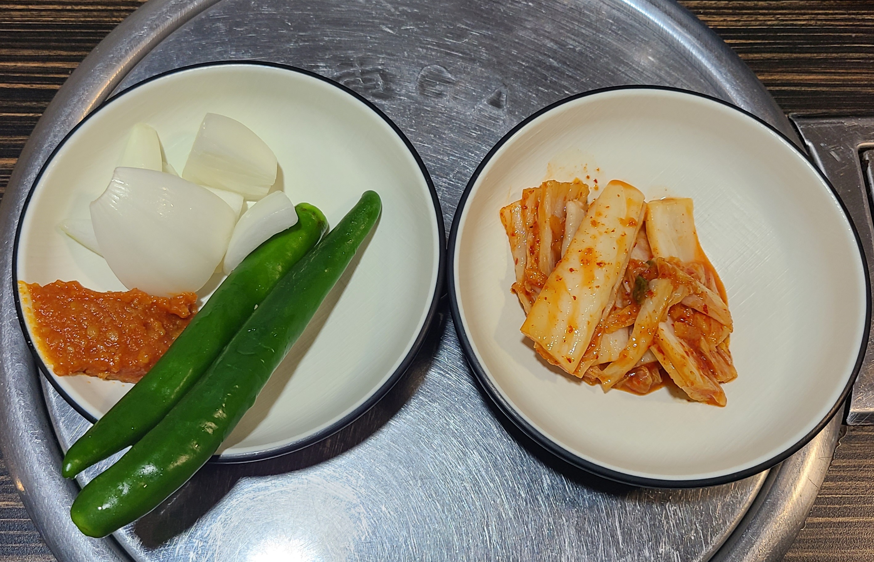 기본반찬은 고추, 생양파, 조금 묵은 김치가 나오는데 싱싱한 것이 입맛을 돋구어 주었고, 셀프로 리필가능했습니다.
