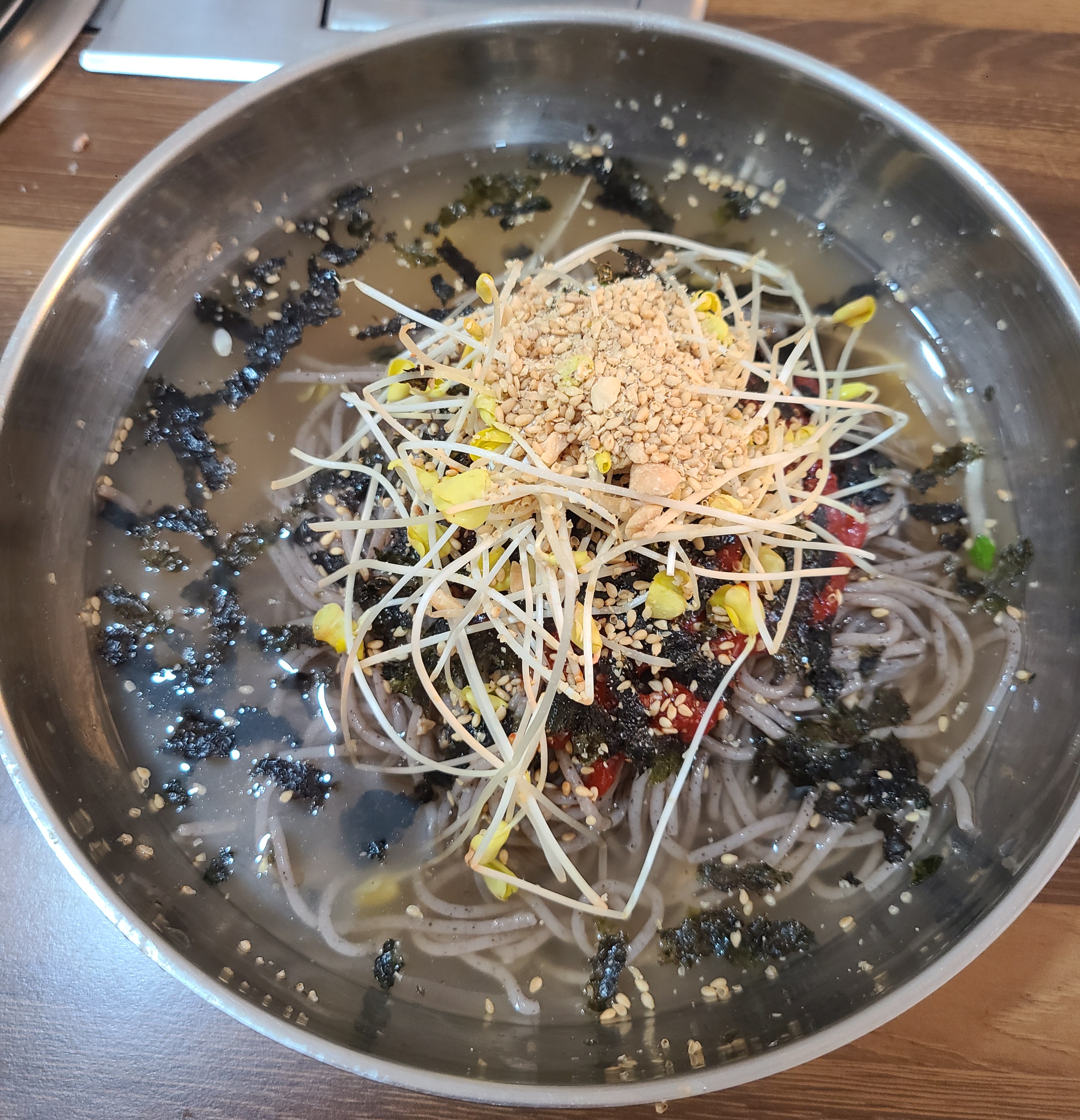 - 물막국수는 적당히 새콤하면서 달콤하고 고소한 맛이 납니다. 메밀맛이 풍기는게 좋았고, 메밀 새싹이 위에 올려져 있어 메밀의 맛을 잘 느낄 수 있었습니다. 다만, 살얼음이 없는 점은 더운 날씨에 아쉬운 점이라고 생각합니다.